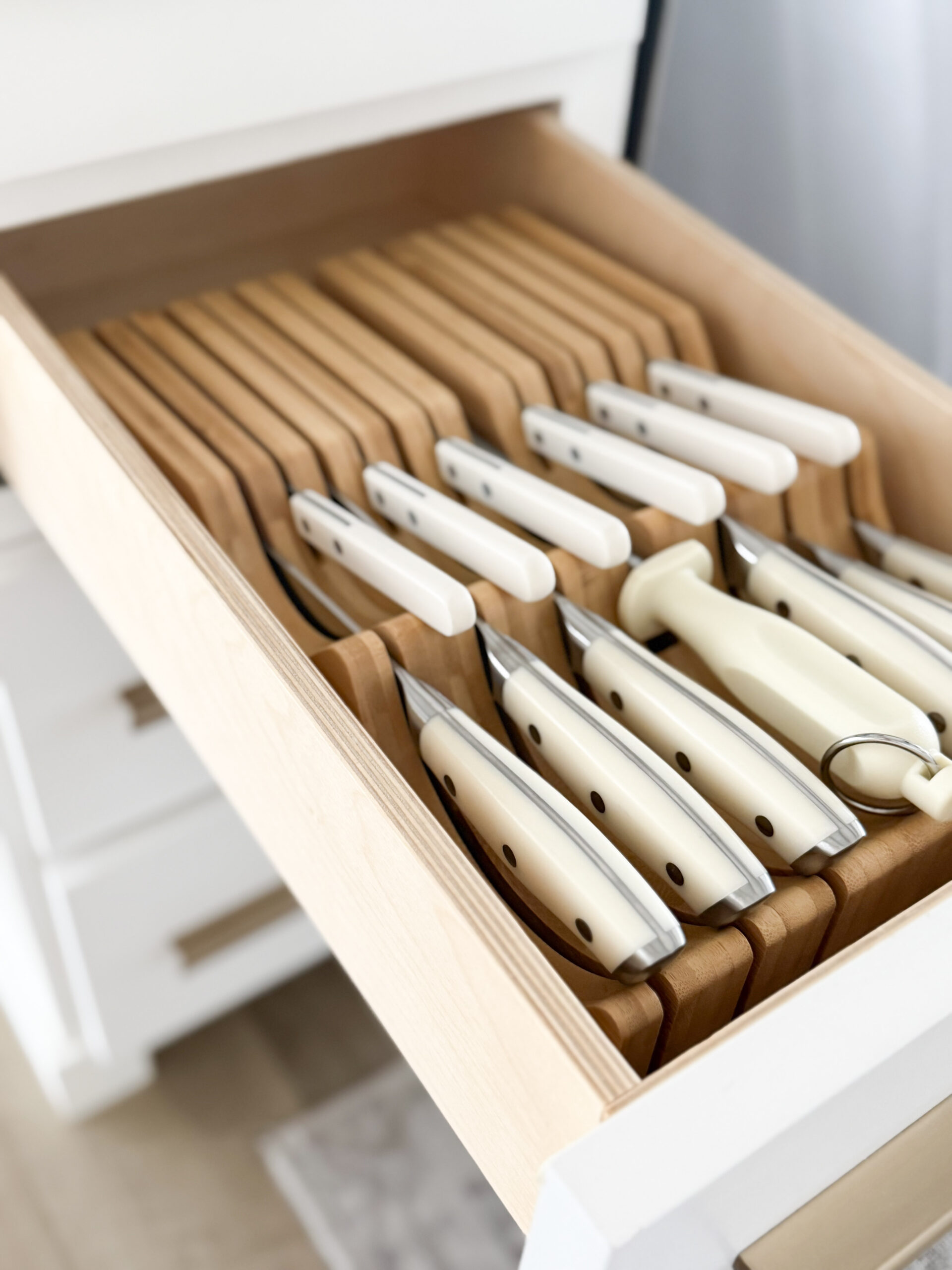 I’m always looking for ways to bring a little more minimalism into our home especially in the kitchen. I never imagined I’d be someone who stores knives in a drawer, but this simple switch has completely transformed our space. It’s been such a game changer for clearing up countertop clutter.