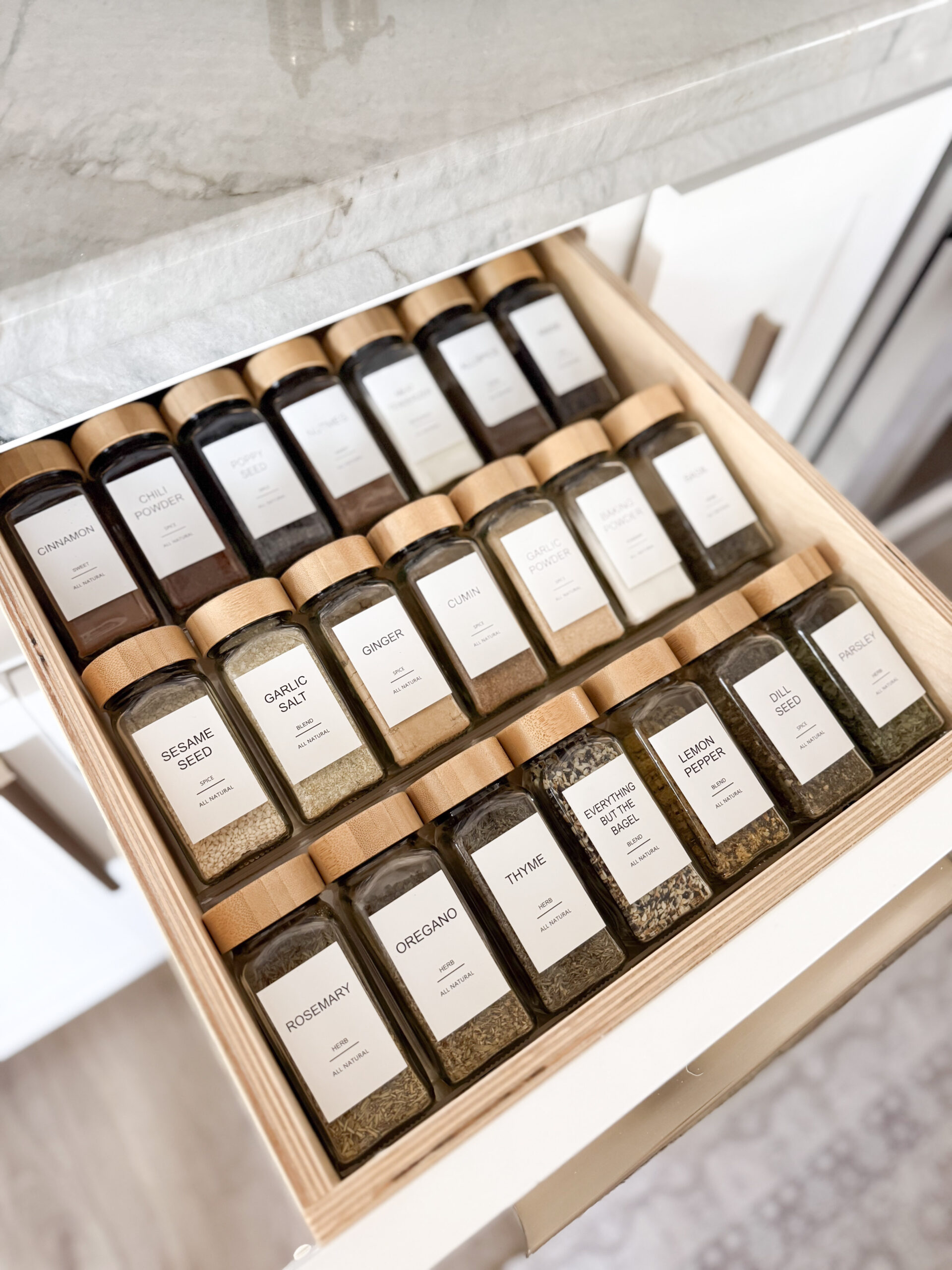 This might just be my favorite part of our recent kitchen refresh. I’ll admit, I wasn’t totally sold on the idea of a spice jar drawer at first. But now? I’m completely convinced. Not only does it free up an entire cabinet, but the minimalist labels and bamboo lids make it incredibly satisfying to look at and use. With the holidays around the corner and extra hands in the kitchen, having every spice easy to spot is such a win. Goodbye, mismatched labels and hello, organized bliss.