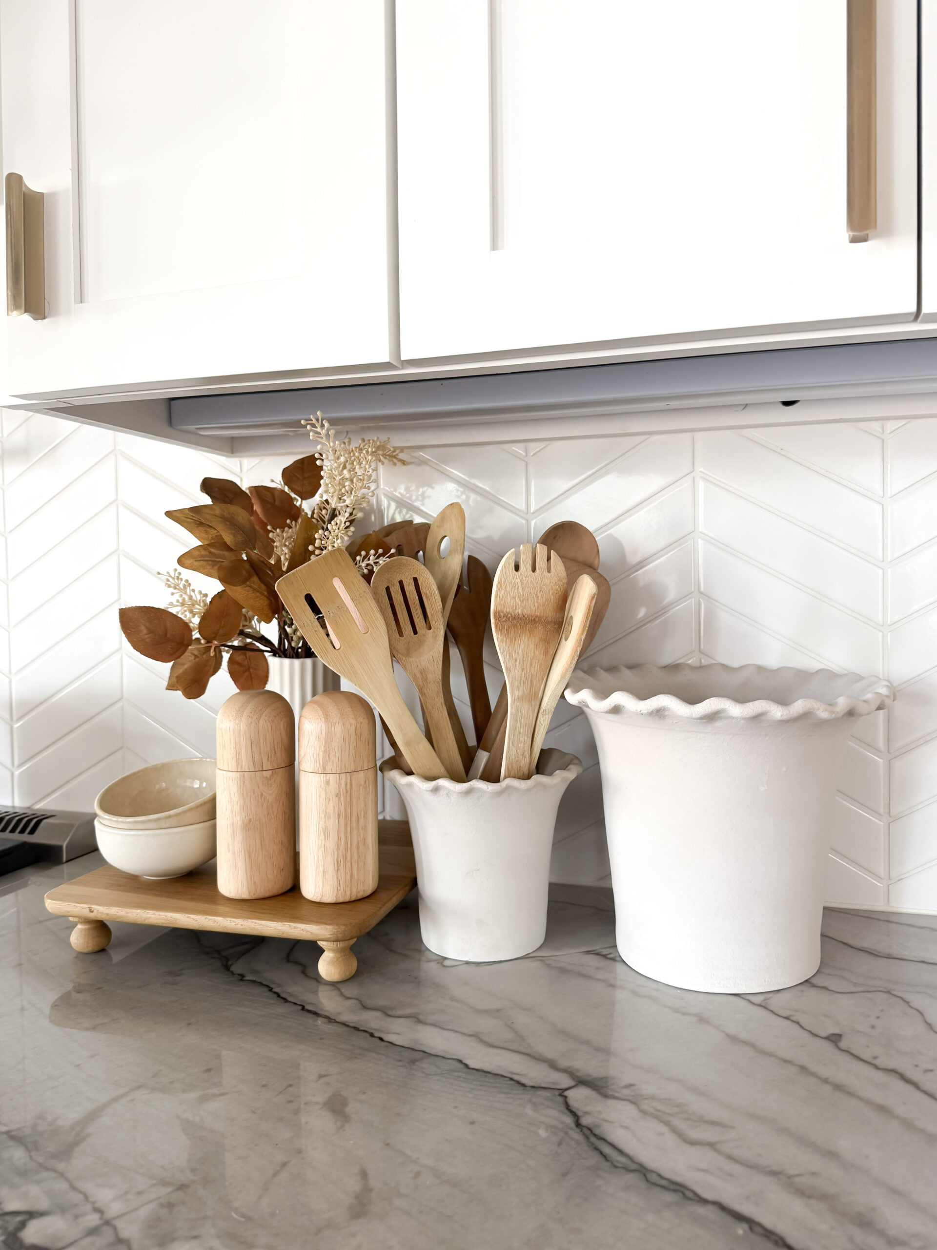 wooden pedestal tray | salt and pepper grinders | similar vase | fall florals | wooden utensils | palermo cachepots